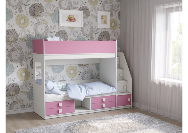 Классическая детская двухъярусная кровать с двумя параллельными спальными местами размером 1750х750 и 1900х750, выдвижными ящиками для хранения и угловой лестницей-стеллажем.
