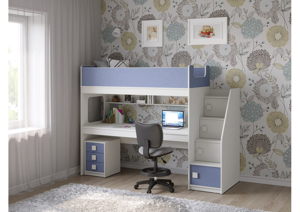Учебная зона со столом под спальным местом открывает возможности для письменных работ,а также здесь удобно расположить ноутбук, а вместительная тумба поможет в хранеии канцелярских принадлежностей и учебников.